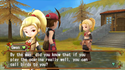 Ihr bekommt von Gwen ein wenig Kritik für euer Spiel und sie erwähnt, dass blaue Vögel den Klang der Okarina mögen. Ihr erhaltet dieses Event auch wenn ihr bei Event 7-3 schrecklich gespielt habt.
