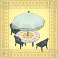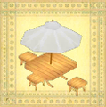 45 - Weißer Sonnenschirm-Tisch Versendet 500.000G an Hüttenland - Hüttenland, 1800G Verkaufspreis: 8400G Material: 3 Weißer Stoff, 10 Kleinholz, 6 Holz |