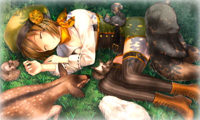Agate steht mit zwei Füchsen auf dem Waldpfad, kichernd darüber das sie kitzlig ist. Sie erklärt, dass sie mit den Tieren spielt. Sie lief vorbei und wurde von ihnen abgelenkt. Agate fragt, ob ihr alle gemeinsam spielen wollt.